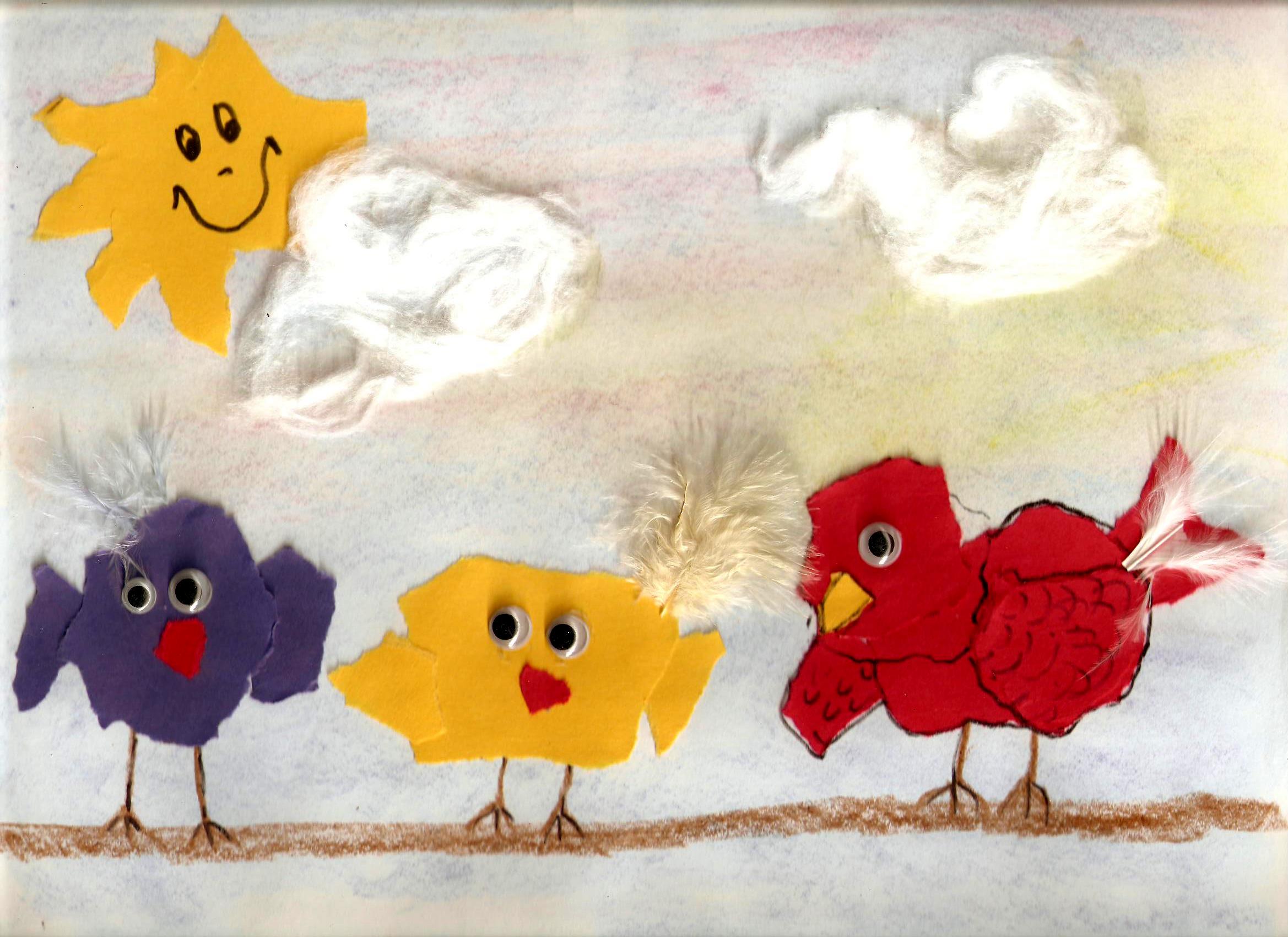 - Tear birds from the red, yellow, and blue scraps. Body and wings for each. Glue above the branch.