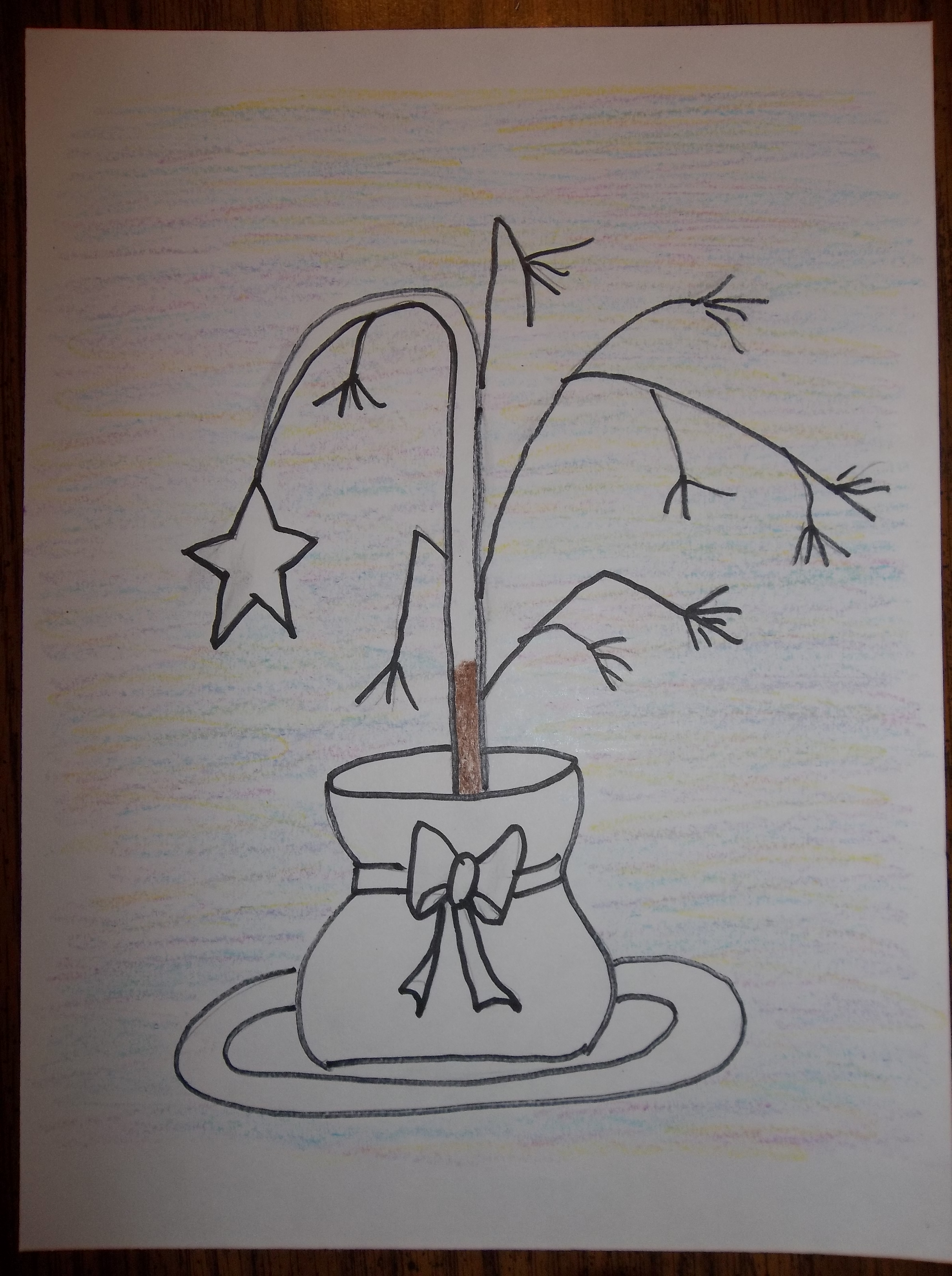 Outline the drawn picture using a black Sharpie. Then lightly color in a background, being careful to avoid the tree pot, rug and ornament.