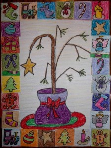 In this project the second grade art class draws a picture of Charlie’s tree, lightly colors in a background, colors the drawing, and then either makes their own border or, if class time is a concern, use the included border images.