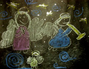 - With white chalk, draw two or more angels on the black paper. Remember perspective—the further away something is, the smaller and higher on the page, the nearer something is the larger and closer to the bottom of the page. Stress the necessity of keeping their hands above the drawing so the chalk doesn’t become smudged.