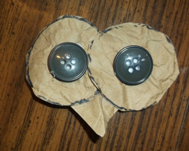 6. With a black Sharpie, draw two 1 1/2″ diameter circles on a piece of brown grocery bag paper. Overlap and glue the two circles together. Glue buttons to the center of the circles.